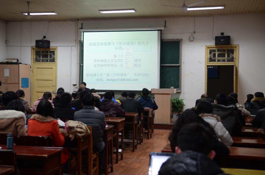 2013年12月20日晚上7点在历史文化学院1201教室举行了桂子山国学讲坛第三期,本次讲座邀请到了国学院副院长张三夕教授,他演讲的是“谈谈史部要籍和〈资治通鉴〉的几个问题”讲座由董恩林教授主持,来自各院各专业的师生聆听了本次讲座。