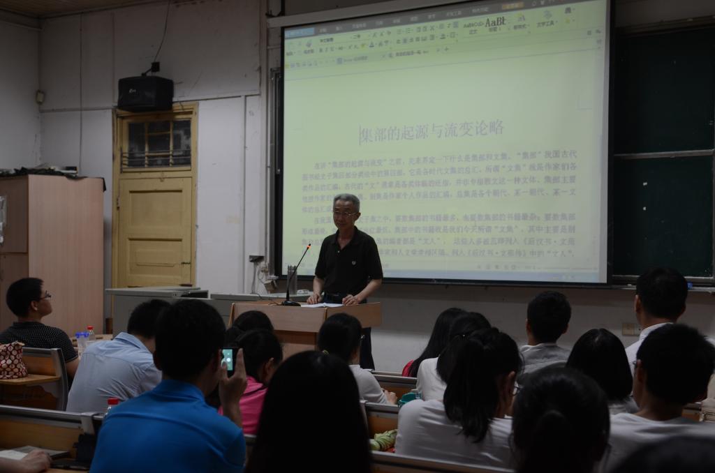 2015年5月27日晚上7点,桂子山国学讲坛第八期在历史文化学院1201教室举行。本次讲座邀请到了华中师范大学文学院教授戴建业,他演讲的题目是“集部的起源与流变”。本次讲座由国学院教授柏俊才主持,来自各院各专业的师生聆听了本次讲座。
